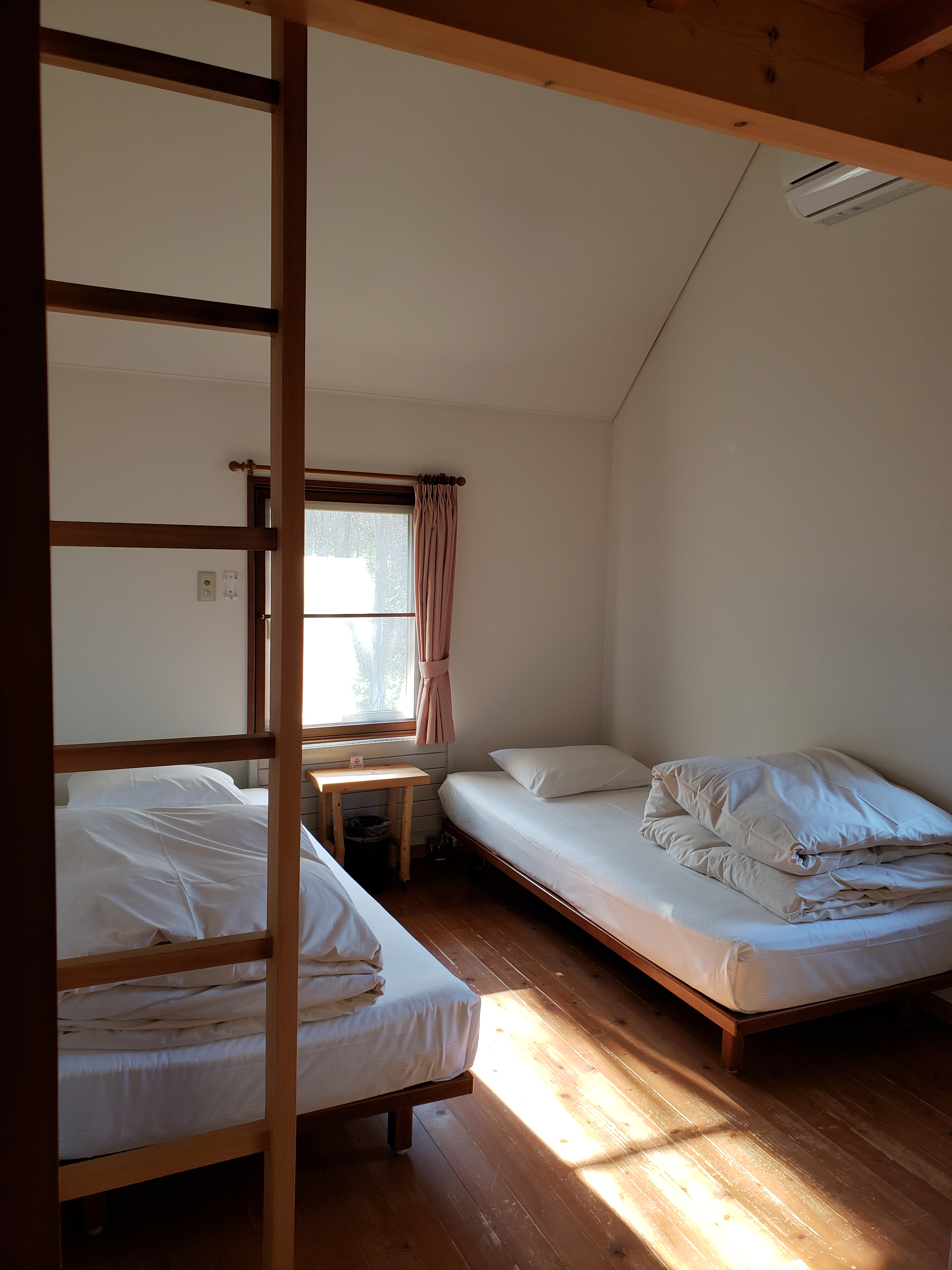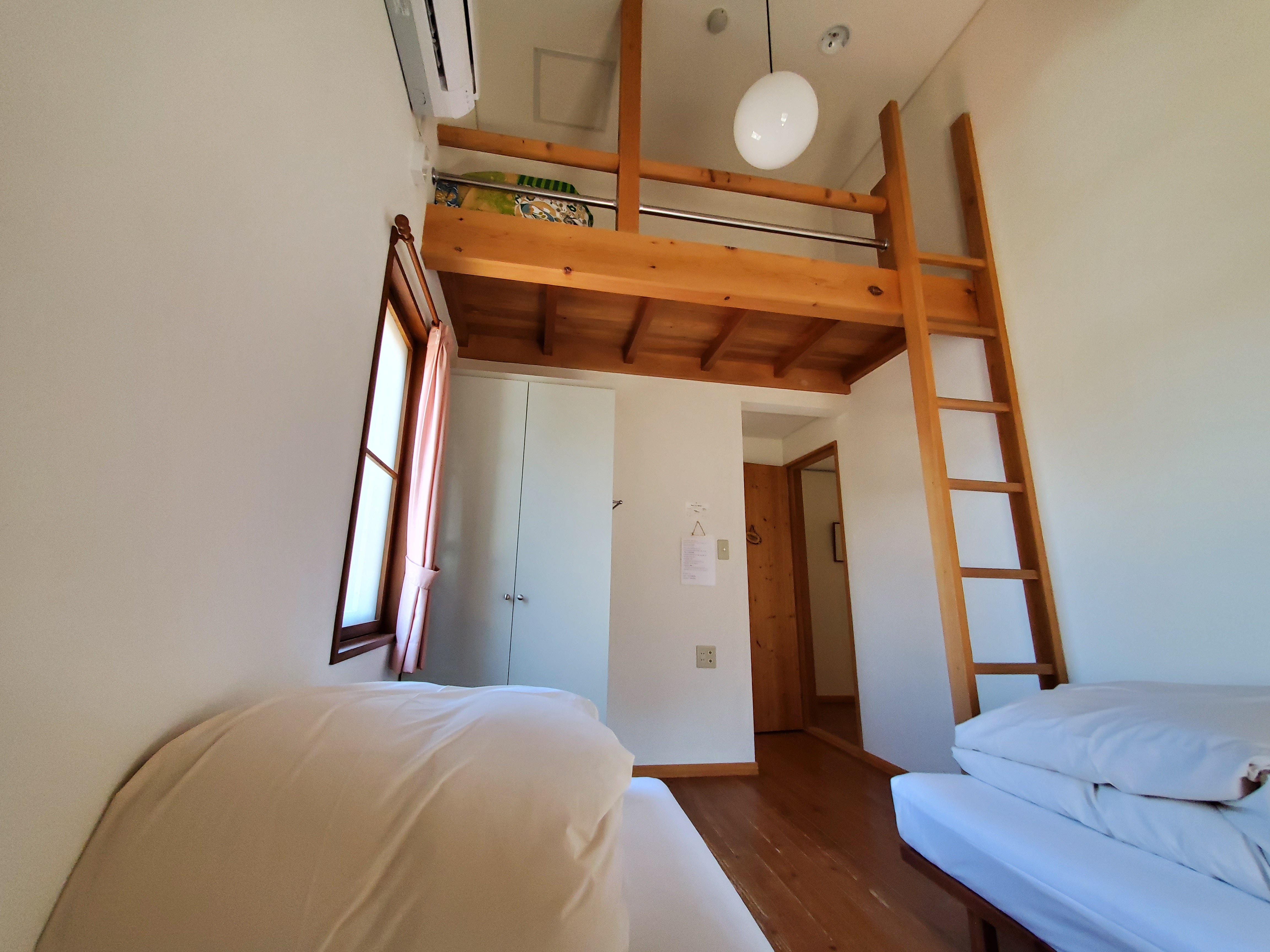 お部屋は全てベッドが2つのツインルームです。また2階のお部屋にはロフトがございます。ロフト部屋は3人までご利用可能です。※ロフトははしごを登っていただくような造りとなっております。小学生以下のお子様、ご高齢の方のご利用はご遠慮ください。※全室エアコン完備 ※館内は全て禁煙 ※テレビ・冷蔵庫の設置はございません。